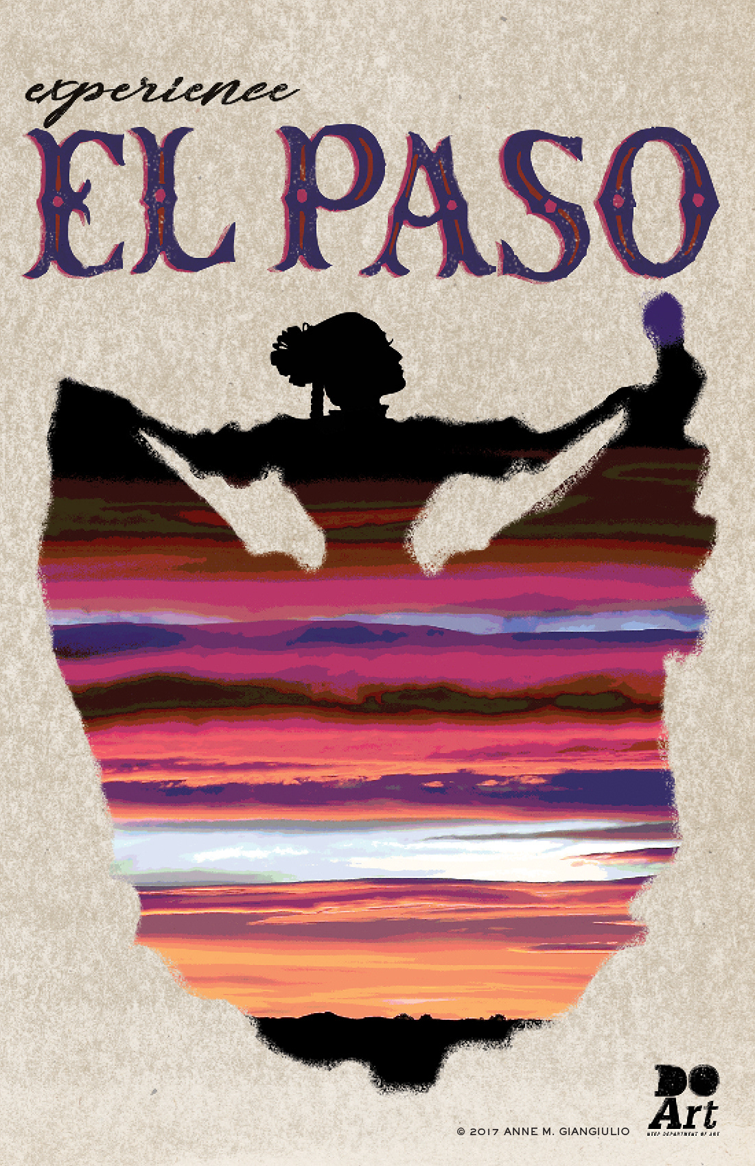 I asked my intermediate-level Graphic Design 4: Typography class students, "As a designer, how would you attract non-El Pasoans to our fair city?" In the then (2017) political climate, "the border" was depicted as a place of lawlessness, insecurity, and ugliness—a place where a “big, beautiful wall” would be a welcome addition. I asked them, "You actually live here—is this how you see it? What is our true reality of life in El Paso? What do you believe are our strengths and points of beauty? This poster is meant to explore this truth, namely our assets, and convey them to those who perhaps only have formed their opinions of the border by what they see on national TV, having never stepped foot here."